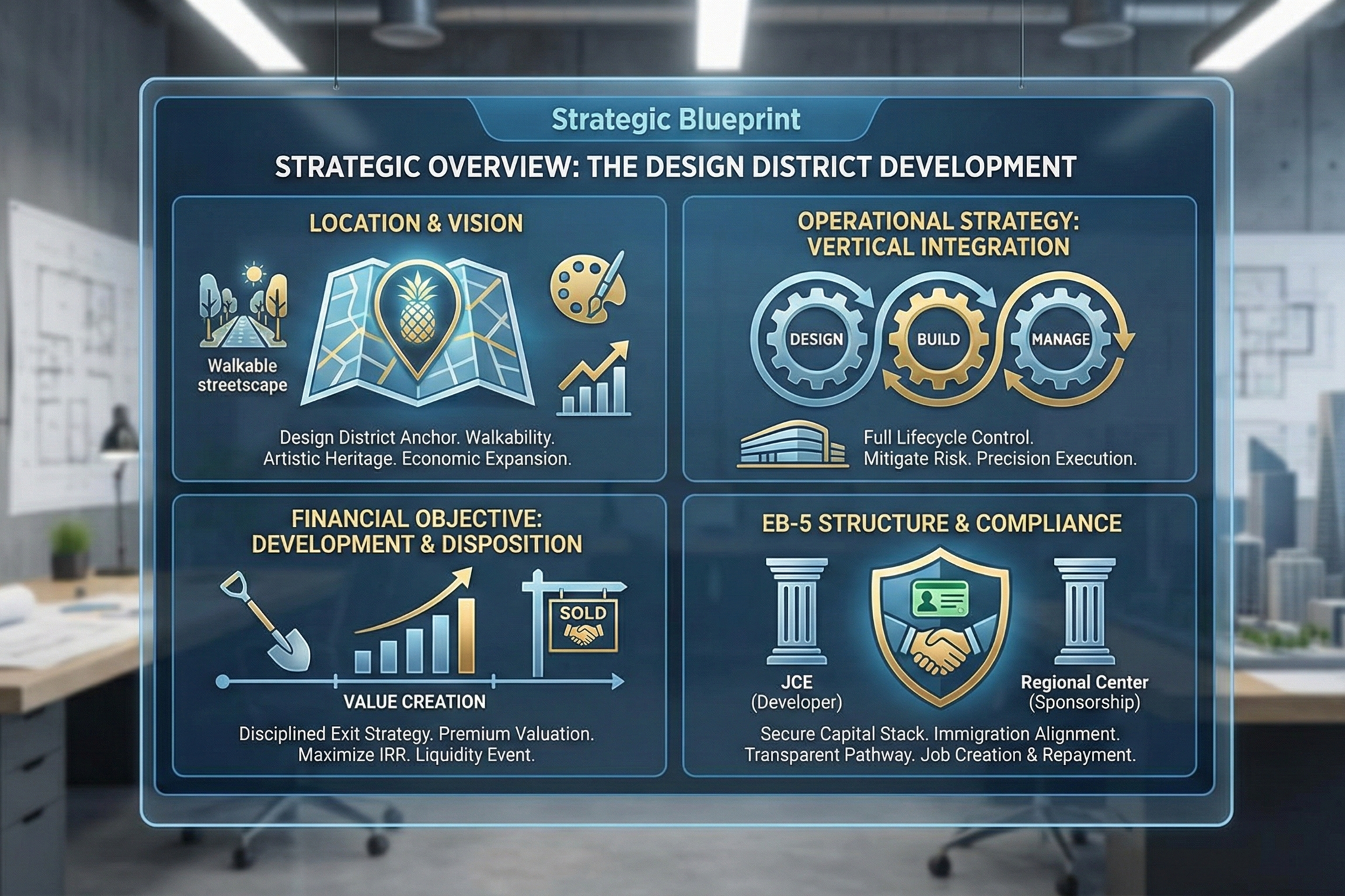 Commitment to Class 1 Members For our Class 1 Members, this structure provides peace of mind. The Regional Center’s primary mandate is to protect the immigration intent of the investor. By separating the role of development (executed by the JCE) from the role of compliance (managed by the Regional Center), we eliminate conflicts of interest and ensure that the project remains focused on its two primary goals: delivering a profitable Design District asset and securing permanent residency for our partners.